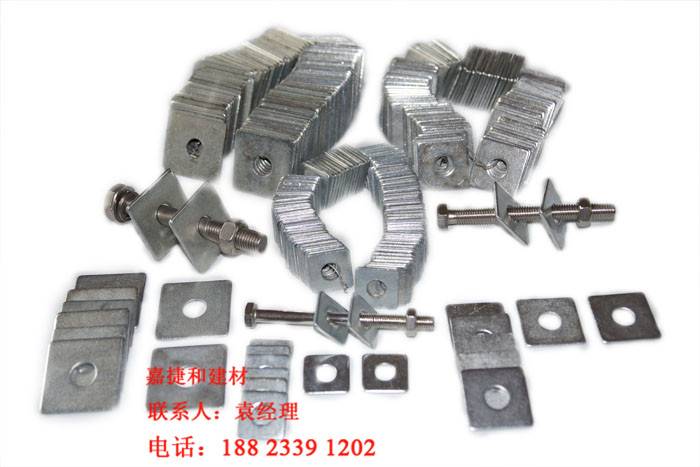 (2)玻璃幕墙类别:嵌入式零件,通道嵌入式零件,镀锌钢板,转角,镀锌垫片,耐火铁皮,单元板支架,橡胶垫片,
